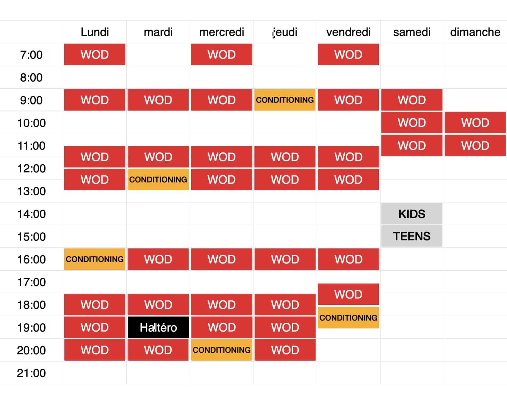 Accessible à tous les niveaux, ce cours vous permet de travailler les différentes compétences athlétiques du CROSSFIT. A travers un entrainement sur-mesure au poids de corps, le WOD CONDITIONING vous permet de développer votre cardio, votre souffle ainsi que votre endurance. Construit autour de mouvements simples, il met également en jeu un véritable renforcement musculaire. Vous débutez en CROSSFIT, souhaitez perdre du poids, vous tonifier ou vous sculpter de façon harmonieuse ? Ce cours est fait pour vous !